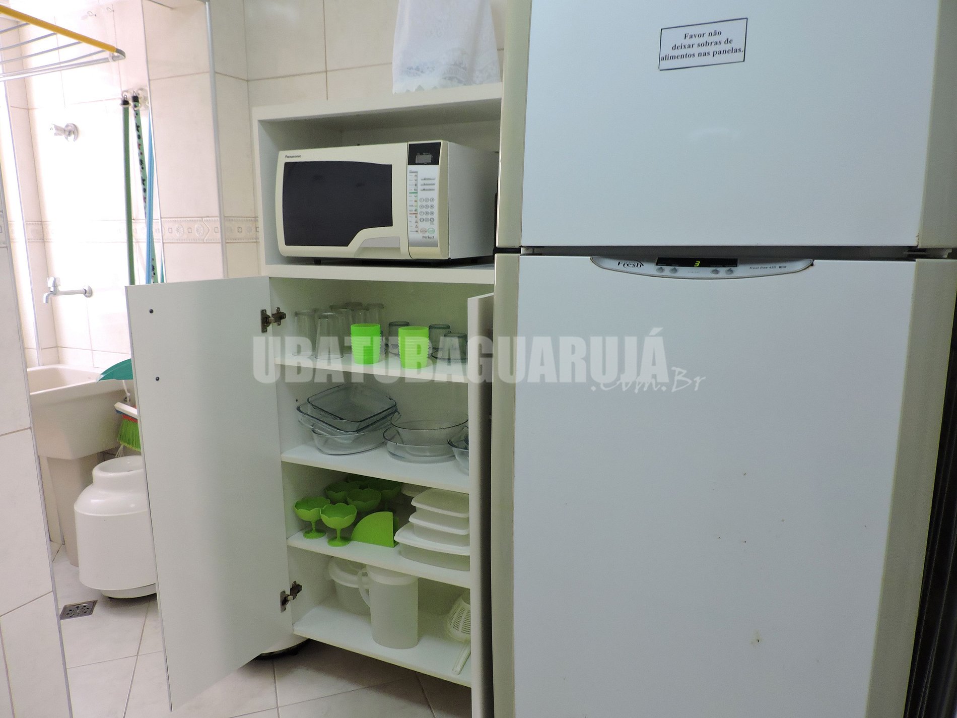Cozinha com fogão, geladeira duplex frost-free, microondas, liquidificador e utensílios de cozinha completo.