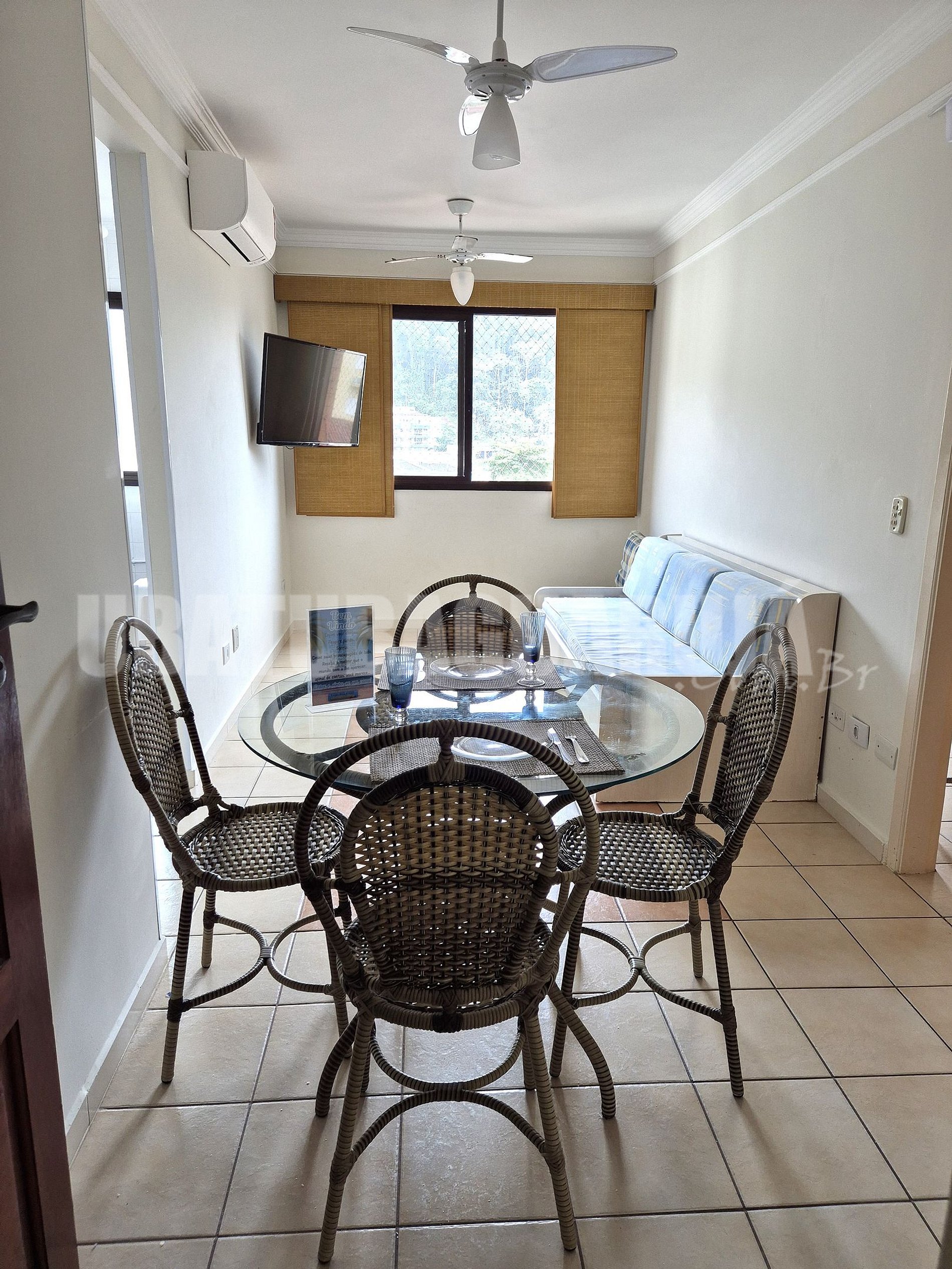 Sala com sofá, televisão, ar condicionado e dois ventiladores de teto.