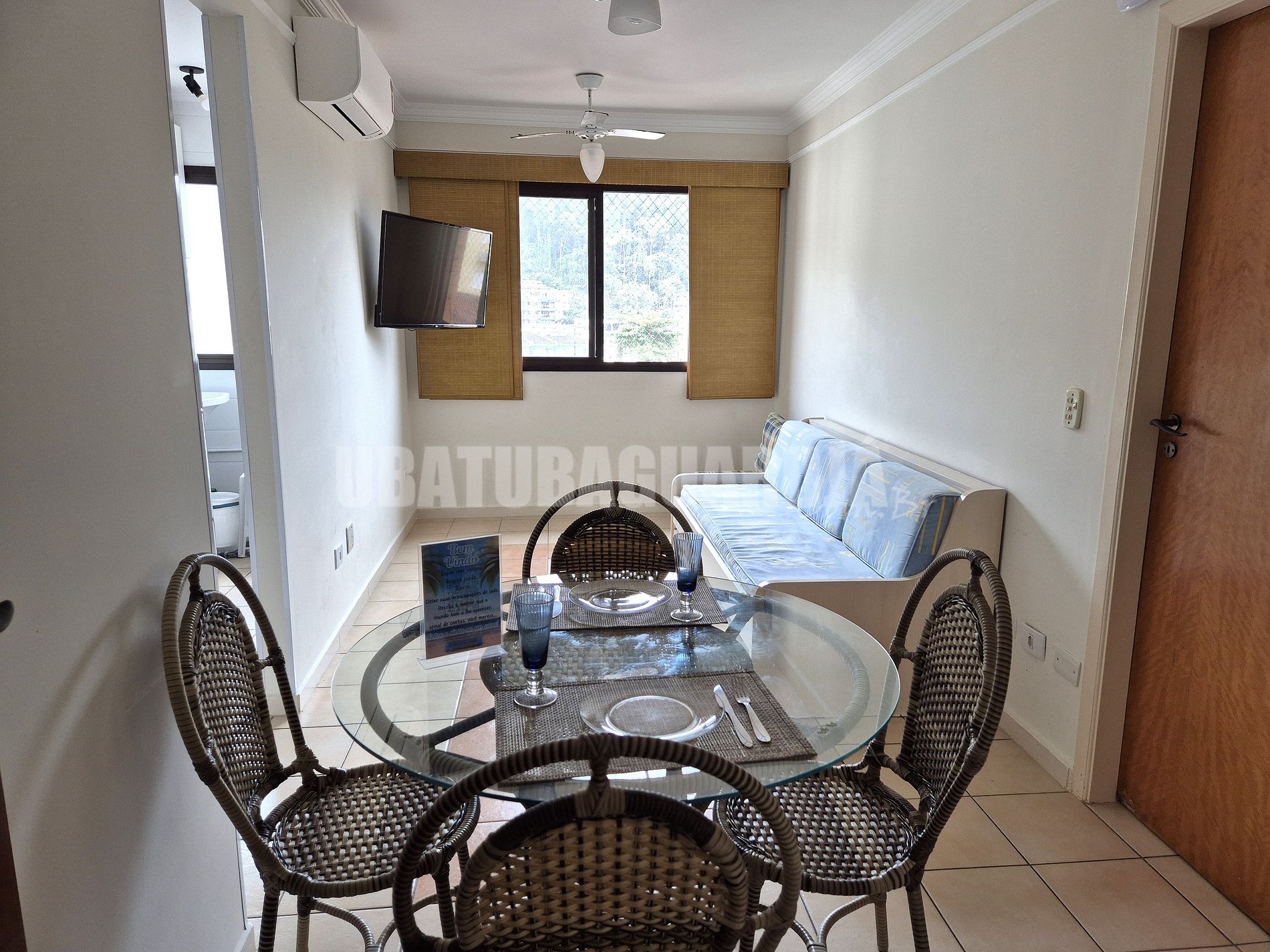 Sala com sofá, televisão, ar condicionado e dois ventiladores de teto.