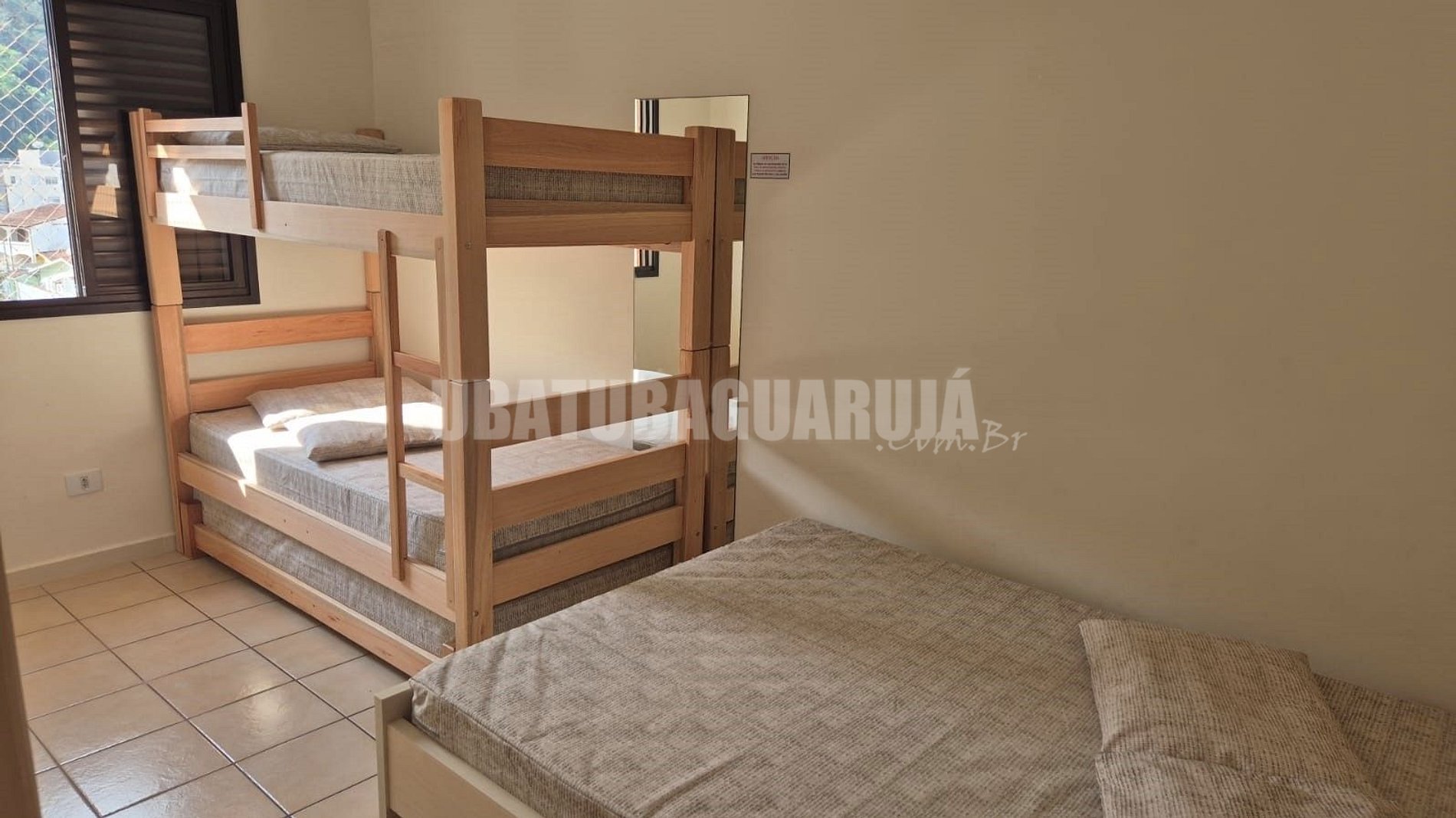Quarto com uma cama de casal, beliche e uma cama de solteiro, ar condicionado e ventilador de teto.