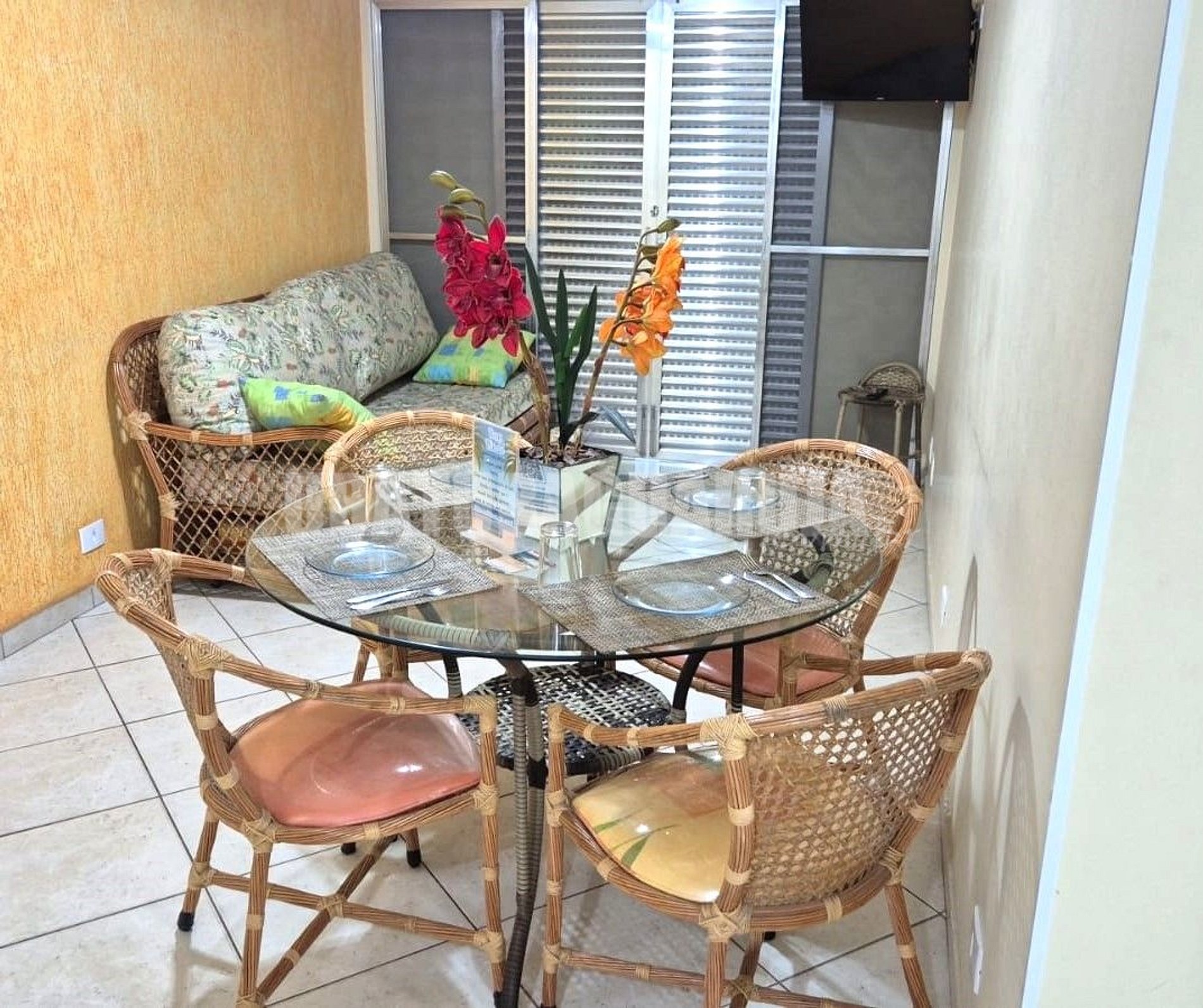 Apto de 1 dormitório a duas quadras da praia da Enseada para até 5 pessoas no total contando com as crianças independente da idade.