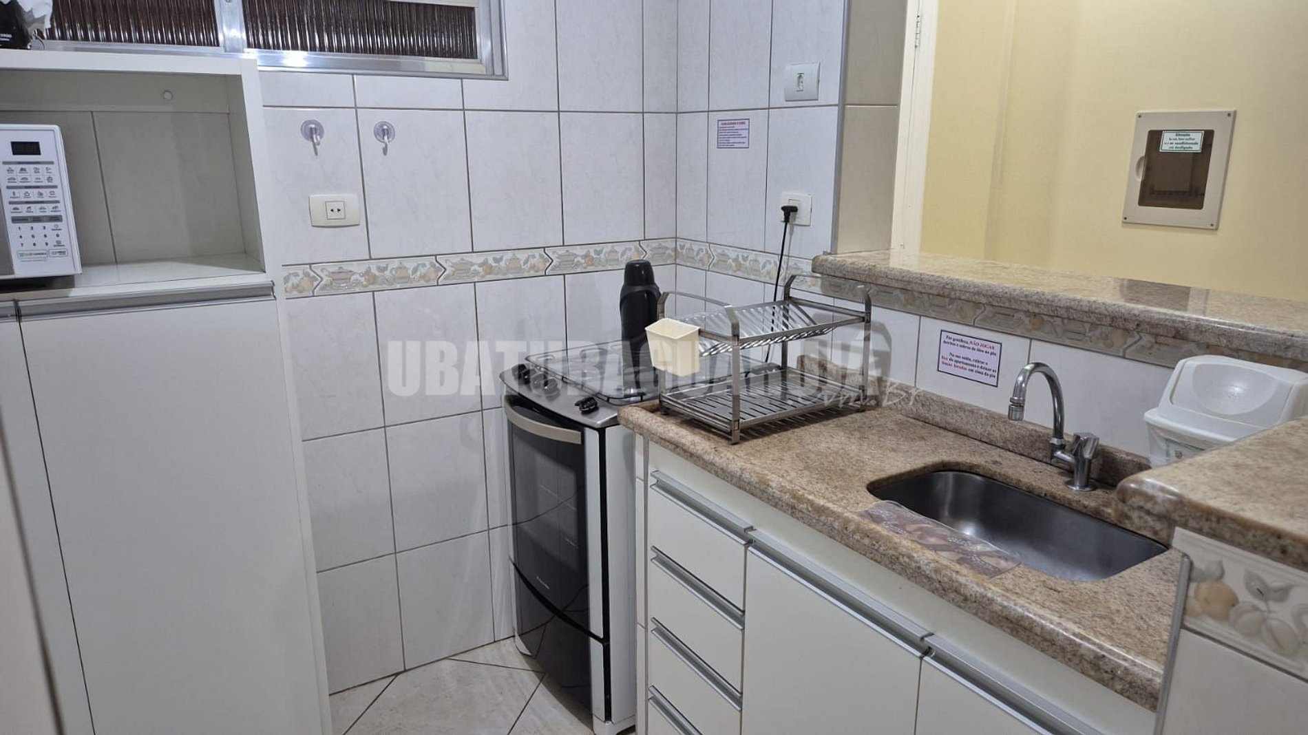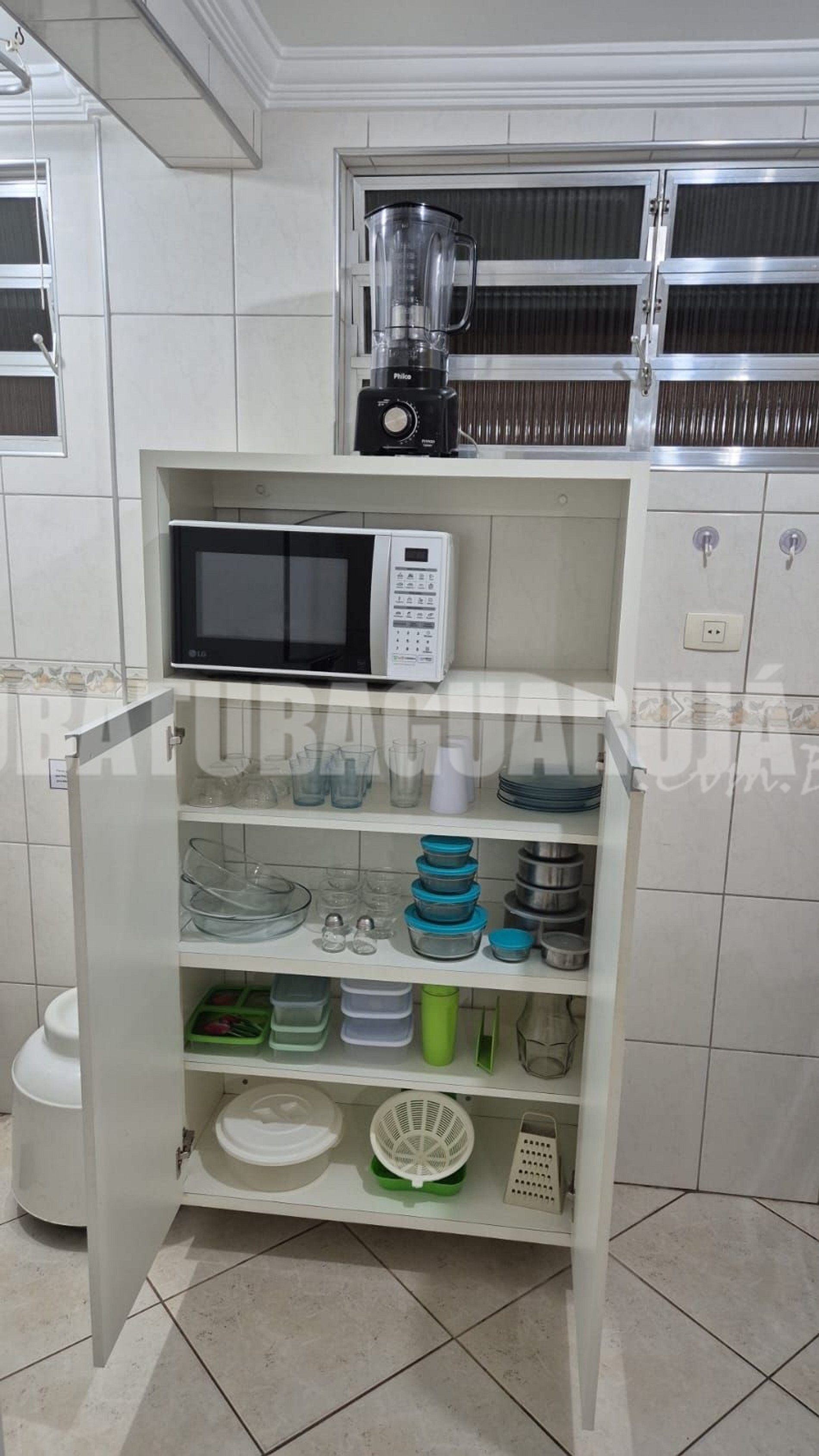 Cozinha com fogão, geladeira duplex frost-free, microondas, liquidificador e utensílios de cozinha completo.