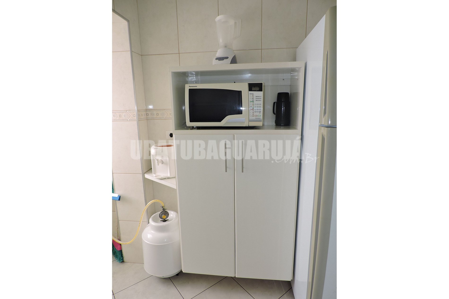 Cozinha com fogão, geladeira duplex frost-free, microondas, liquidificador e utensílios de cozinha completo.
