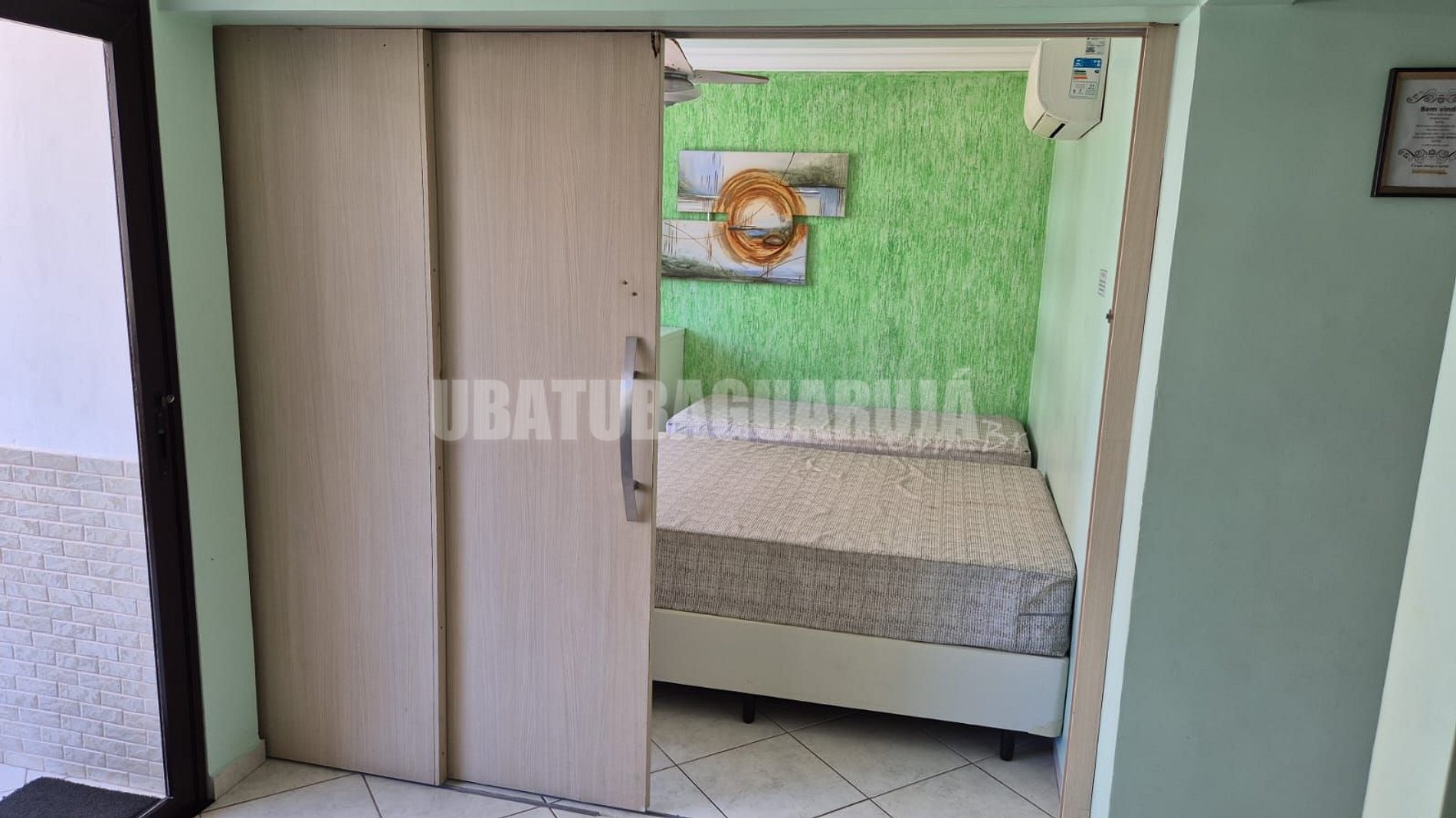 Quarto de casal 1: uma cama de casal box, 1 beliche, prateleiras, cabideiro, ar condicionado e ventilador de teto.