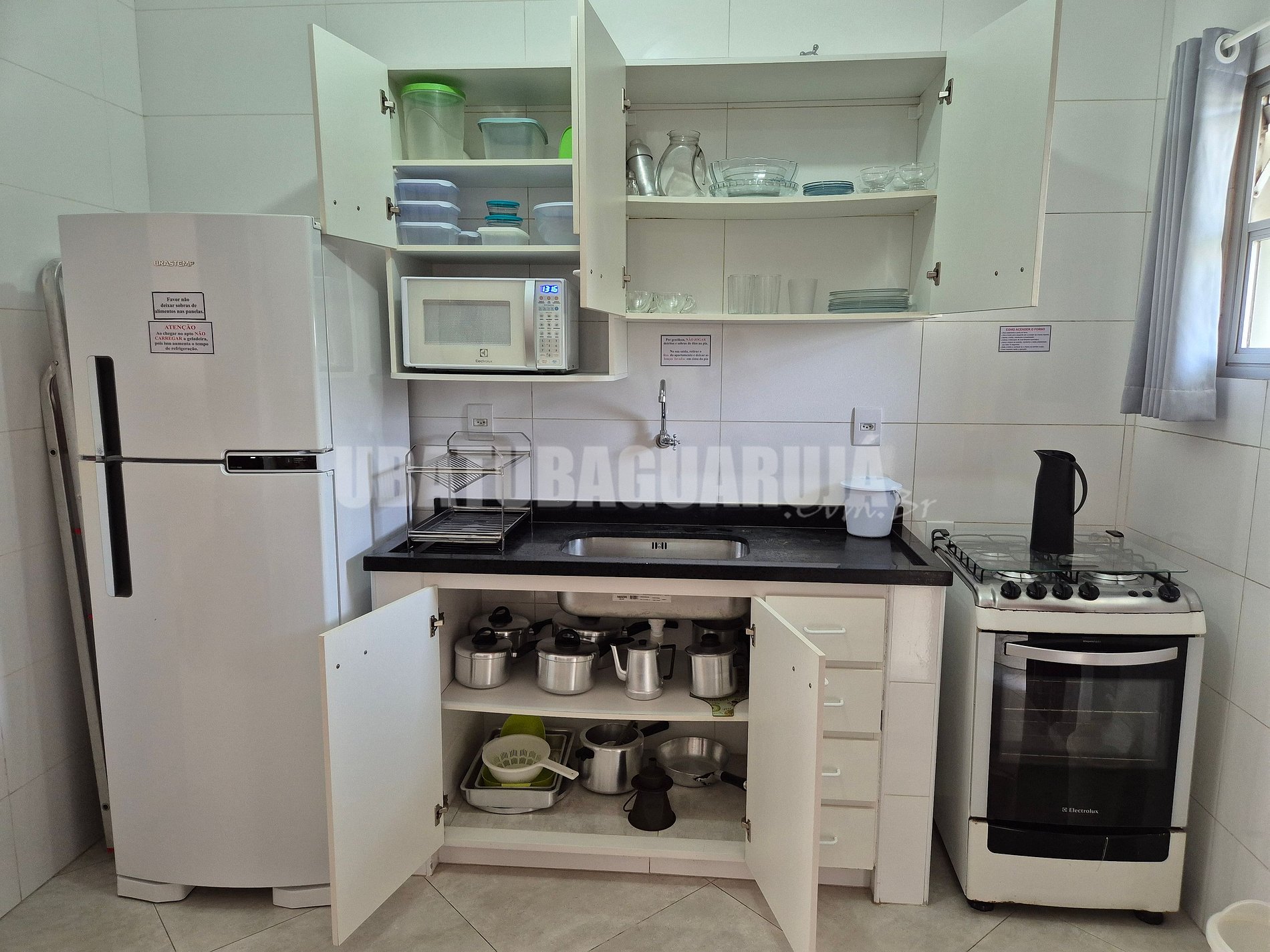 Cozinha com geladeira duplex frost-free, fogão, micro-ondas, liquidificador, utensílios de cozinha completo.