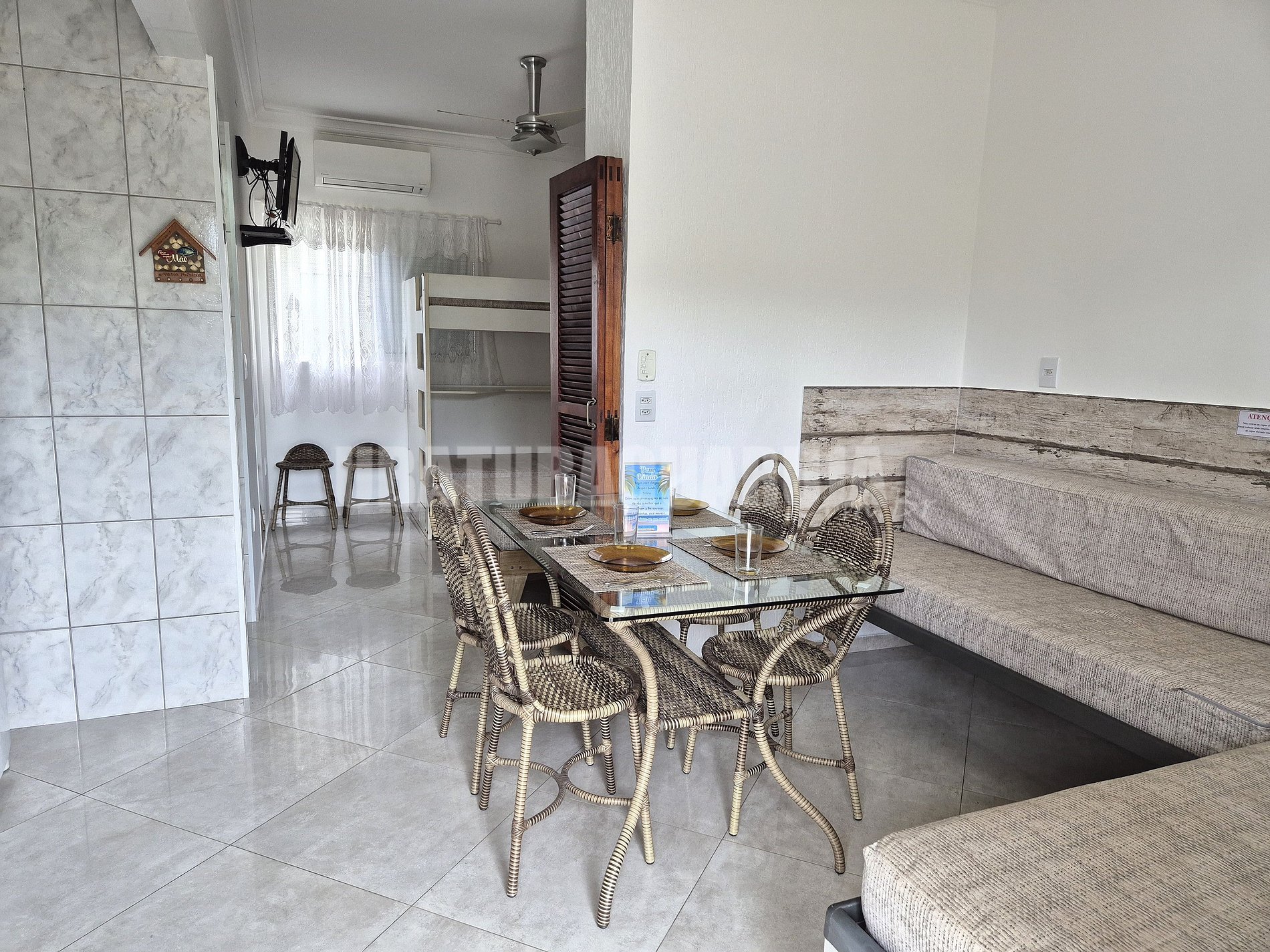 Sala conjugada com a cozinha: duas camas de solteiro fixa, ventilador de teto e mesa com cadeiras.